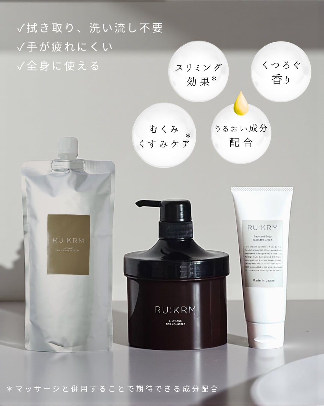 マッサージによりメリハリがついた身体を、より美しい肌*に魅せてくれるよう導きます。(※メイクアップ効果による)
