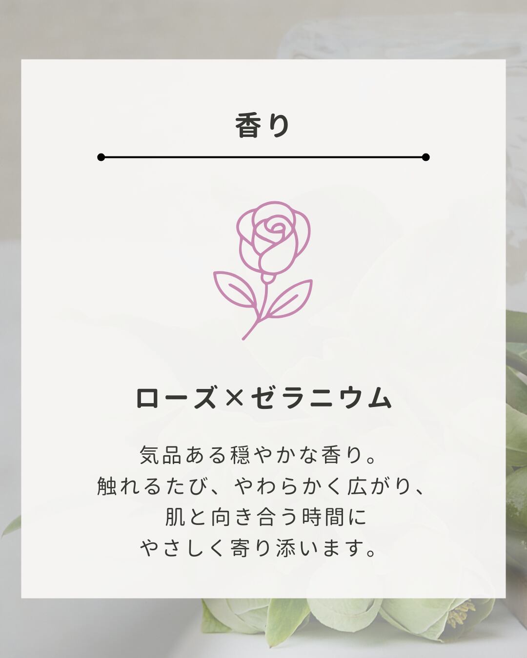 ローズ(ダマスクバラ花油)とゼラニウムの気品ある穏やかな香りが、優雅なセルフケアタイムを演出します。