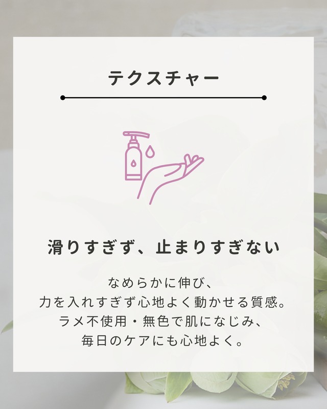 なめらかでコクのあるテクスチャーがやさしく肌になじみ、“滑りすぎず、止まりすぎない”絶妙な設計で、手のひらの感覚を心地よくサポートします。
