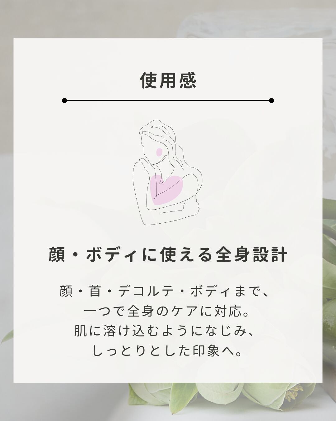 ローズ(ダマスクバラ花油)とゼラニウムの気品ある穏やかな香りが、優雅なセルフケアタイムを演出します。